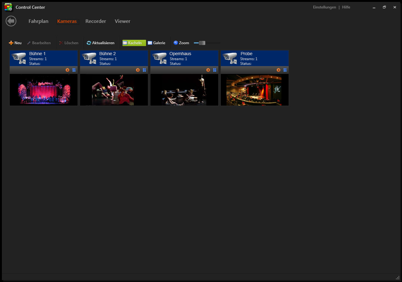 Videoübertragung, live von der Bühne ins Foyer und/oder andere Räumlichkeiten, wie z.B. die Kantine. Zeitgesteuerte Übertragung, Aufzeichnung und automatische Archivierung der Vorstellungen oder Proben . Weltweites Bereitstellen und geschützter Abruf für einzelne Personen oder Personengruppen.